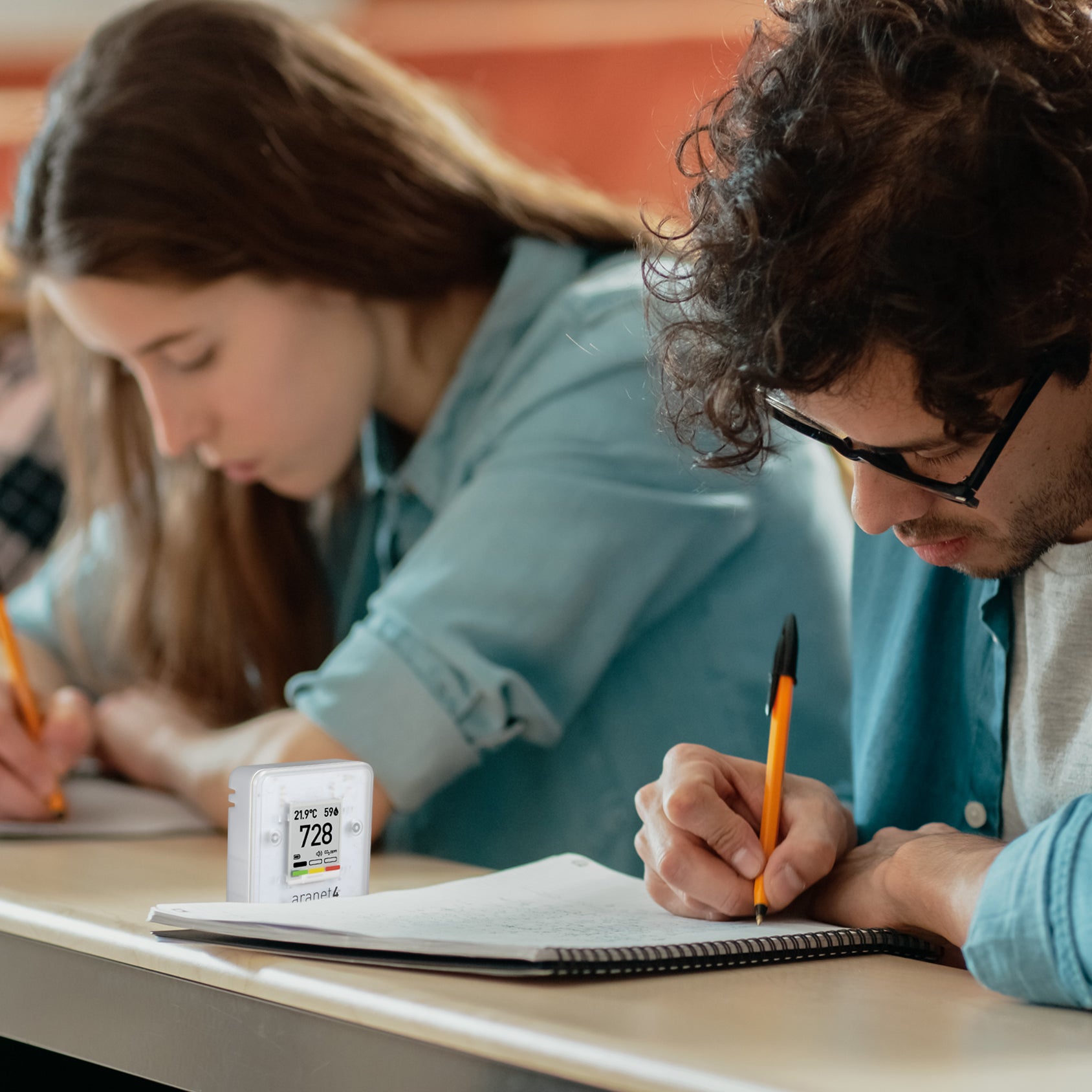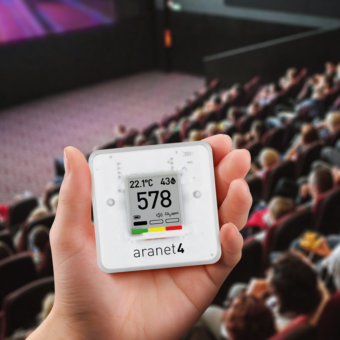 Aranet4 shows CO₂ measurements directly on its e-ink screen with a corresponding colour indicator and configurable sound alarms.