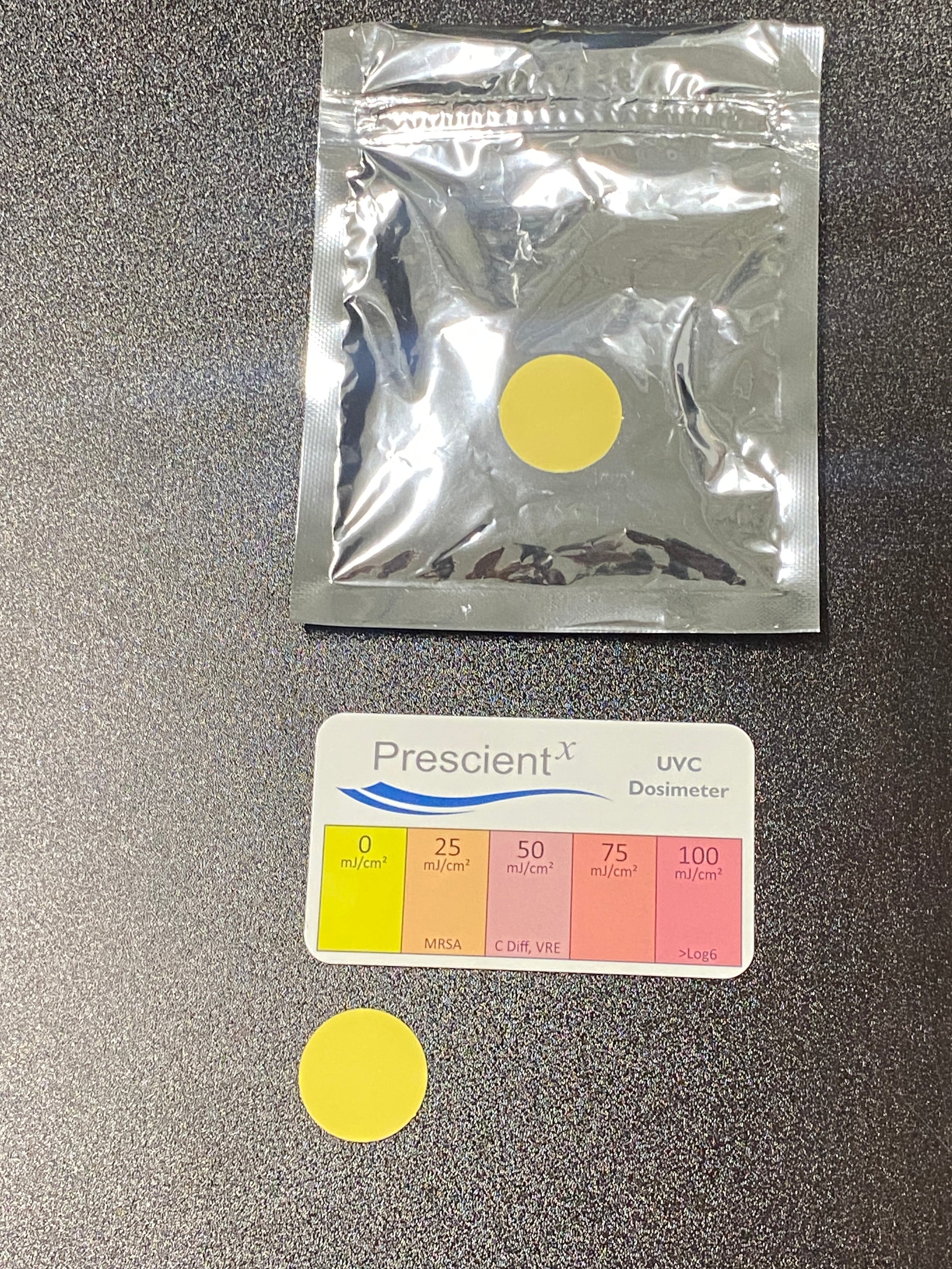 Each package contains 100 dosimeter dots and 3 colour coded UVC detection cards.