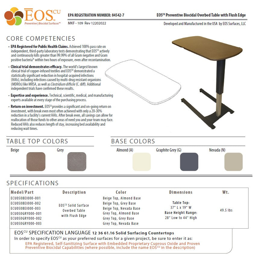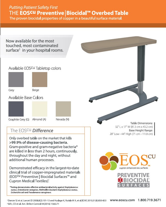 EOSCU overbed tables provide a safer option for one of the hardest working pieces of patient furniture. This table can hold dinner, files, medications, and crossword puzzles, but it won't hold bacteria.