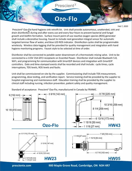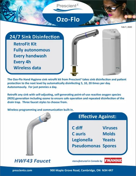 The Ozo-Flo Hand Hygiene sink retrofit kit from Prescientx takes sink disinfection and patient protection to the next level by automatically disinfecting 5, 10, 20 times per day. Autonomously. For just pennies a day.