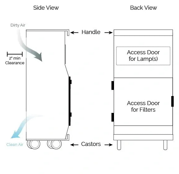 Combines high efficiency filter with high UV efficiency treatment: the lamp is parallel to the airflow and encase in a reflective aluminum case for better efficiency. UV lamp will provide high output germicidal UVC and UV-V oxidation to attack chemical and odours.