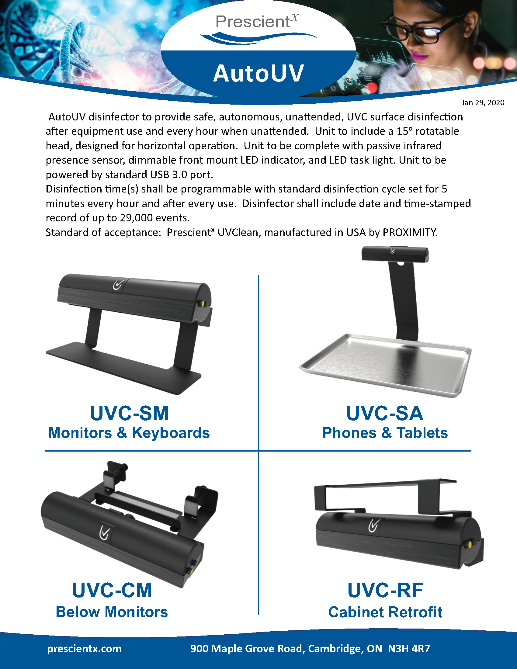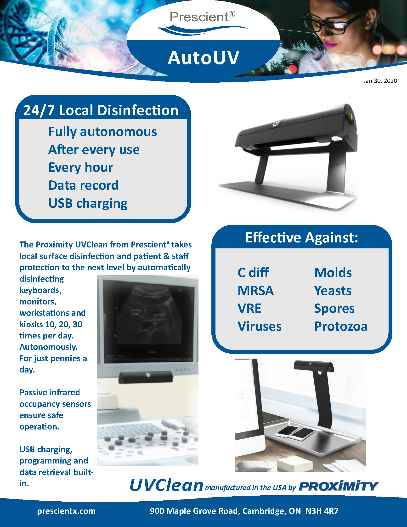 The Proximity UVClean from Prescientx takes local surface disinfection and patient & staff protection to the next level by automatically disinfecting small devices such as smartphones, tablets, and key cards, 10, 20, 30 times per day. Autonomously. For just pennies a day.
