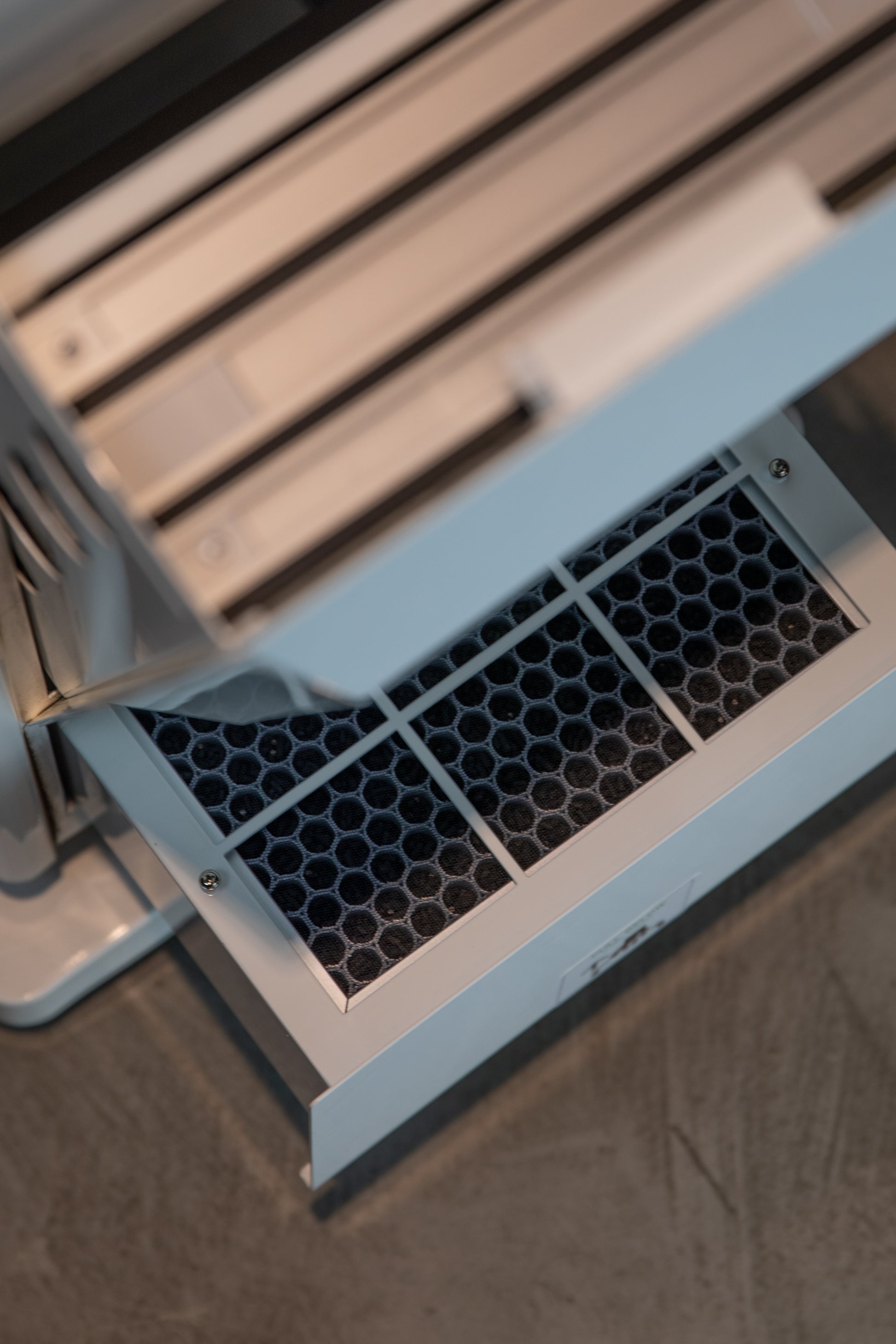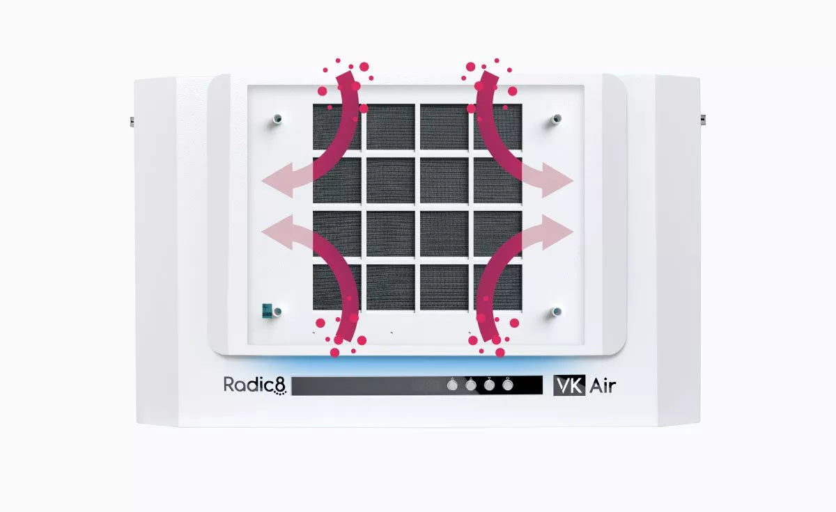 The VK AIR (VK 401)’s multi-stage filtration features a pre-filter, granular activated carbon, and an H13 HEPA filter to remove coarse, fine, and ultrafine particulates and VOCs.